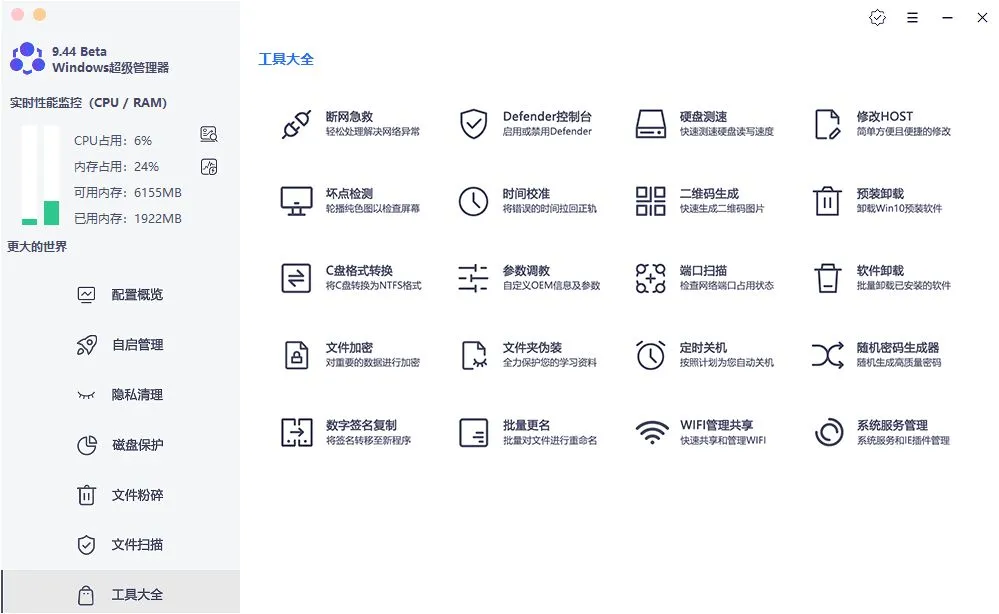 Windows超级管理器是一款采用易语言开发的免费、无广告、功能齐全的系统管理工具。它集硬件实时监控、垃圾清理、隐私保护、启动项管理、文件粉碎等常用功能于一体,可快速查看计算机配置详情,适合开发者与普通用户日常维护系统。相比同类软件常见的收费登录、体积臃肿、夹带广告等问题,本工具界面简洁、占用极低、无登录接口、无功能限制、可离线运行,兼容Win7~Win11,时隔一年多迎来更新。