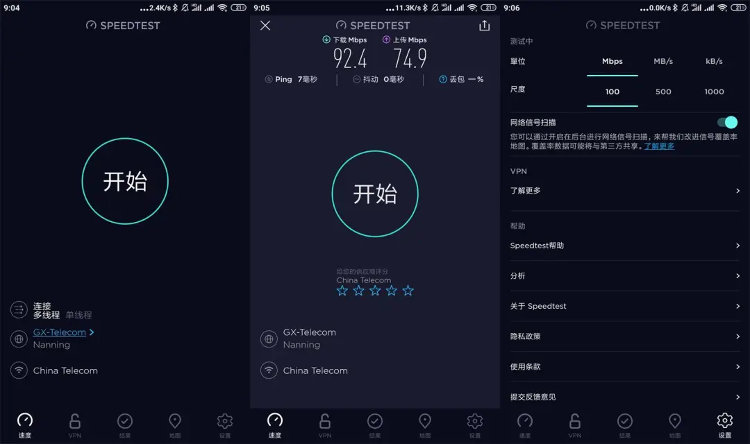 Ookla Speedtest,安卓上称手的随身网速尺。打开点一下,5G、WiFi、光纤统统现形:Ping、下载、上传三条曲线实时跑图,真假带宽立马现形。历史记录自动留档,生成折线图,方便跟人吐槽或跟运营商对线。结果一页就能分享,走到哪测到哪。