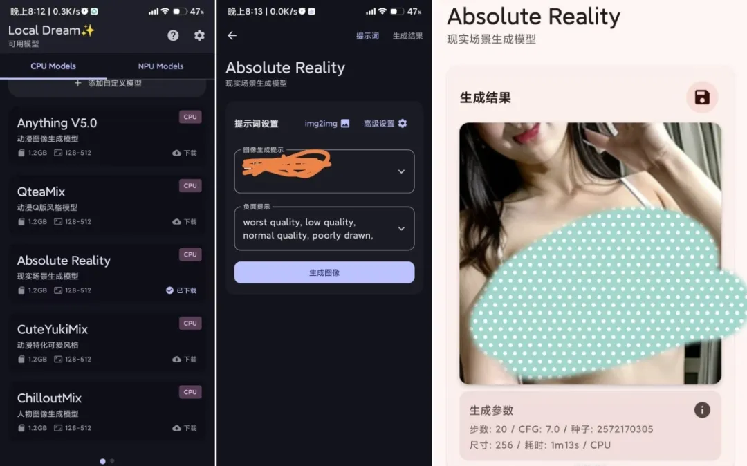 Local Dream v2.1——本地文生图模型,离线创作无边界。与网络版不同,Local Dream 不依赖云端,无需联网即可生成图片,彻底摆脱敏感词限制,真正实现创作自由。无论你想描绘动漫角色、Q 版萌物、现实风景,还是精致人像,都能一键生成,满足个性化创作需求。